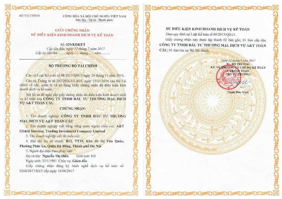 Với các gói dịch vụ này, các doanh nghiệp, cá nhân có thể đơn giản hóa các vấn đề về kế toán, thủ tục cùng với các chuyên gia hàng đầu của chúng tôi. Cam kết những quyền lợi tốt nhất cho khách hàng, các thủ tục, giấy tờ thuế, kế toán đơn giản, nhanh chóng, đảm bảo tính bảo mật cao. Giải pháp kế toán với A&T là sự lựa chọn thông minh cho sự thành công của doanh nghiệp.